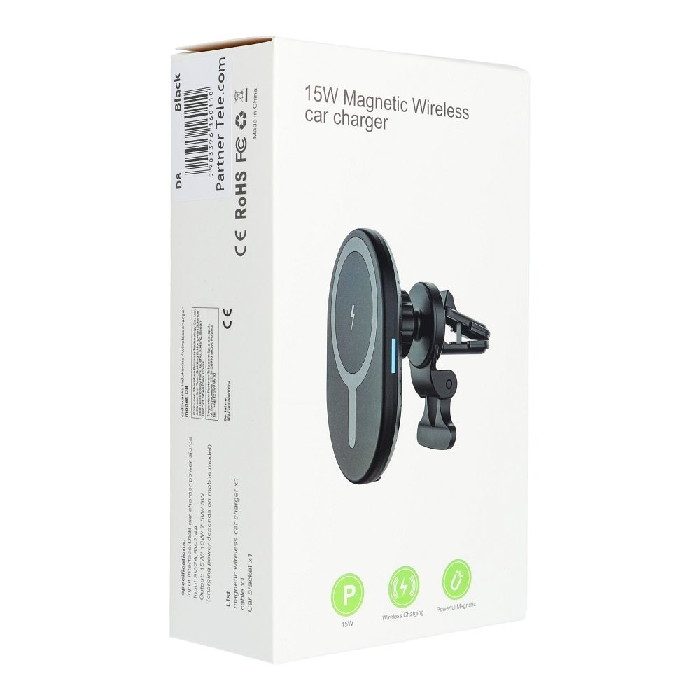 Car holder with wireless charging. Mounted on the air vent. It allows you to safely use your smartphone while driving.