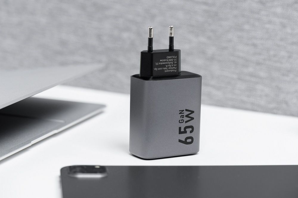 Forcell wall charger made with GAN technology, with a total power output of 65 W. It supports Quick Charge 4.0, Power Delivery and Super Fast Charging 2.0 charging standards and allows charging of phones and tablets as well as laptops. It has three ports – two USB-C and one USB-A – and can power three devices simultaneously.