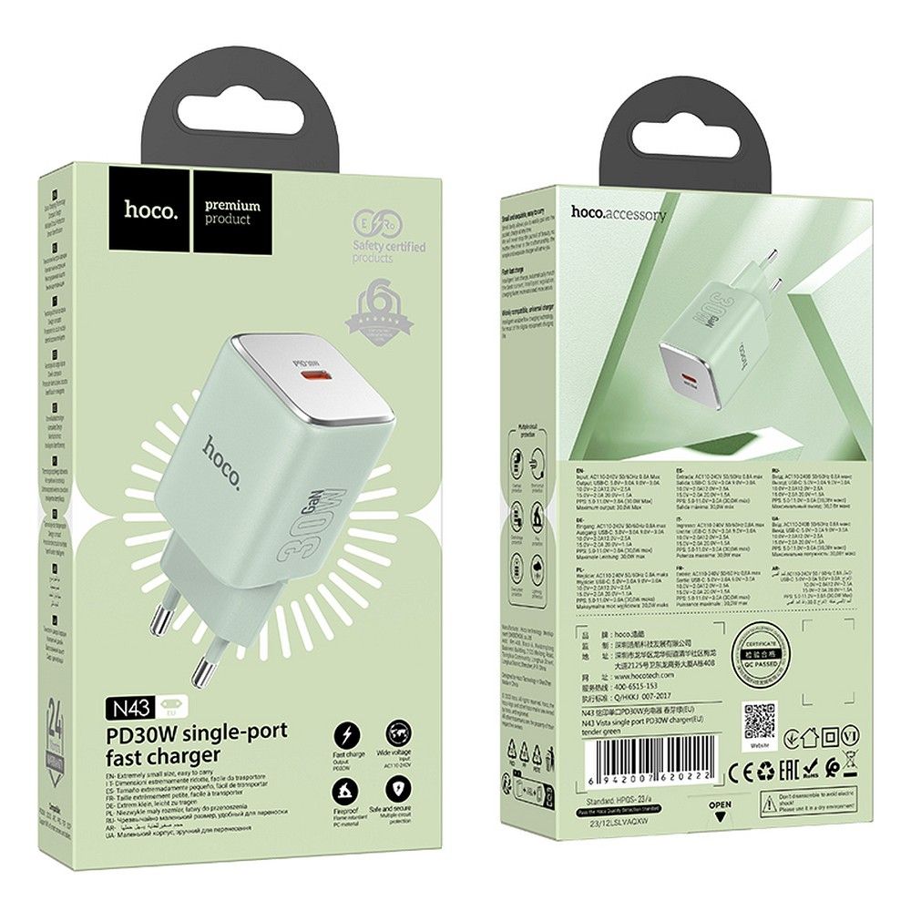 Hoco N43 wall charger with USB-C port and 30W fast charging function. It allows you to quickly charge mobile devices. It was made in GaN technology